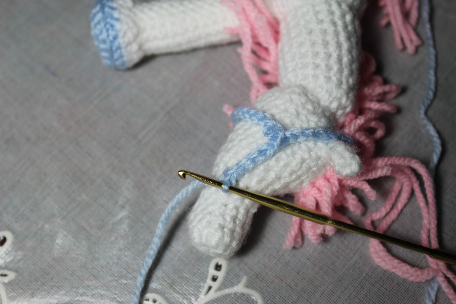 20-th round of stitches. * sc next 2 sts tog, repeat from *till the end of the round ( you should get total of 6 stitches in the round ). Finish knitting and sew the leg to the body.